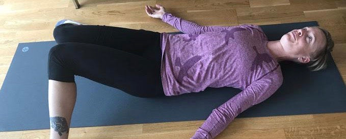 - Lie down with your knees bent and your feet wider than hip width (about as wide as your mat if you’re using one), and extend your arms open to the sides, palms up.