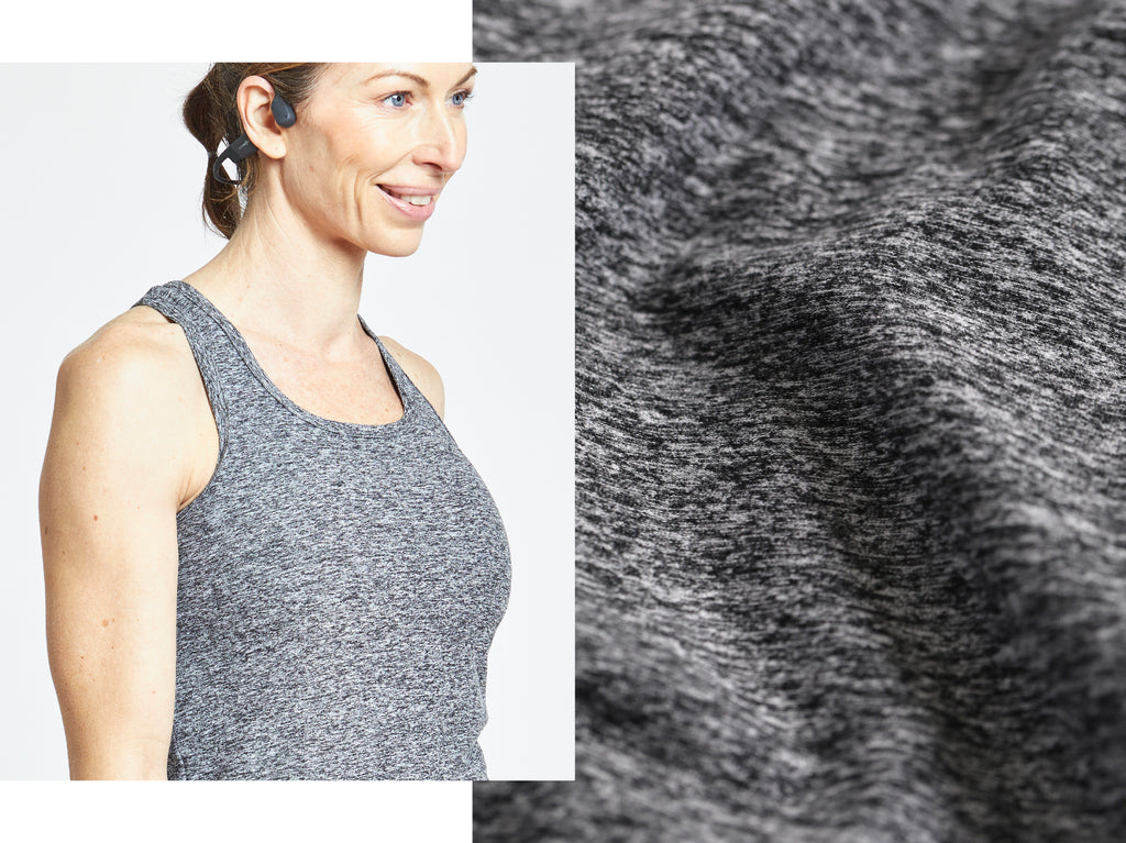 Designed to hold up to the longest runs, HoverFit™, a blend of polyester, lyocell, and spandex made by Polartec®  is one of the most adaptive and technical fabrics we offer. When it comes to running gear, the best pieces are the ones so comfortable, and so optimized for your unique body and needs, that you forget they’re there altogether. As lightweight as they come, Flyout HoverFit™’s one-of-a-kind fiber structure skims the body as it moves, bringing moisture to the fabric’s surface and helping regulate drying in hot-weather conditions. Specialized knit construction, using both hydrophobic and hydrophilic yarns, gives more advanced wicking control to reduce wet-cling and increase airflow breathability for evaporation to dissipate heat, enhancing your body’s own cooling processes. Light as a cloud, and hardworking as armor, Flyout HoverFit™ will be your go-to secret weapon when major miles are ahead.